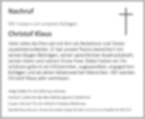 Seit 2006 schrieb Christof Klaus als freier Journalist für Zeitungen, Magazine, Agenturen und Unternehmen – stilsicher, klar und natürlich immer druck- oder webreif. Und als Redakteur und Heftmacher spielte er sein Know-how als thematischer Allrounder (Schwerpunkte Soziales, Bildung, Medien, Sport, Politik, Wirtschaft, Gesundheit, Musik und Kultur) mit einem fachkundigen Blick auf das Wesentliche aus.
